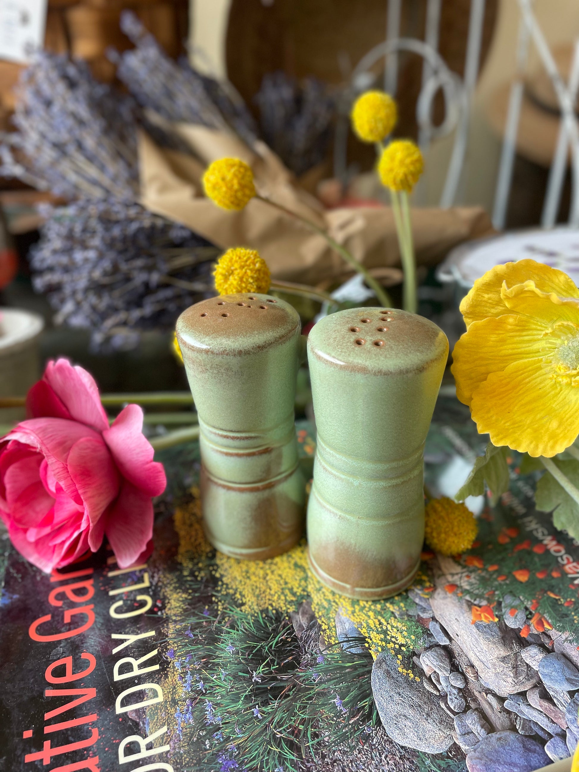Vintage Frankoma salt and pepper shakers. Matches "Vintage Frankoma Wagon Wheel Vase Prairie Green."