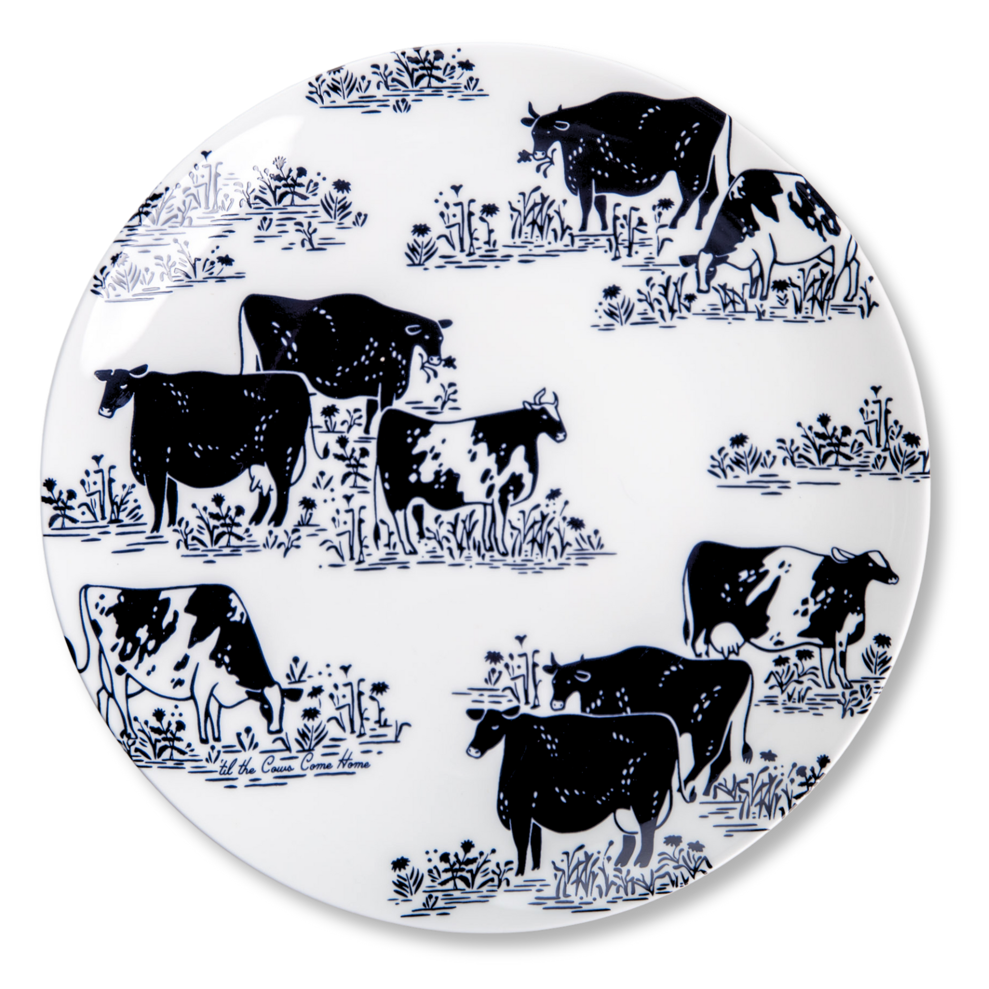 These fat and sassy cows graze the wildflowers and lovegrass in the Southern pasture. My GrandMom Bertha used to say "Look at the bag on that cow! She found a calf last night." These fun and whimsical cows will be right at home on your table! 10.5” diameter Coupe Style Microwave and Dishwasher Safe.